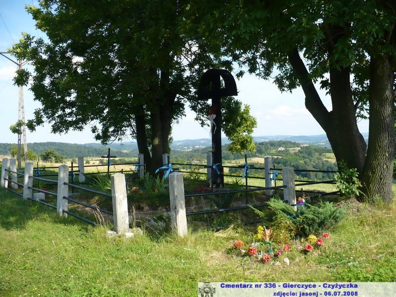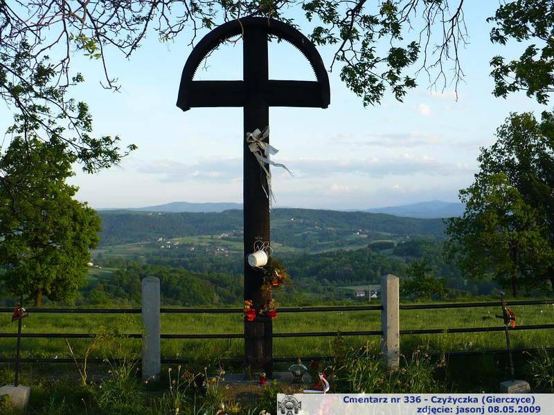 Do galerii zdj臋膰 cmentarza nr 336 doda艂em archiwalne zdj臋cie, a w zasadzie zdj臋cie niezrealizowanego projektu pomnika centralnego, kt贸ry mia艂 stan膮膰 na Czy偶yczce. Projekt ten zamie艣ci艂 w swojej ksi膮偶ce Oktawian Duda, a pochodzi on z opracowania R. Broch, H. Hauptmann, Die Westgalizischen Heldengraber aus den Jahren des Weltkrieges 1914-1915. W swojej ksi膮偶ce Duda podaje: „Centralnym elementem kompozycyjnym cmentarza w Gierczycach-Czy偶yczce (okr臋g boche艅ski) mia艂 by膰 wysoki kopiec-kurhan o zaokr膮glonych kszta艂tach, wymienianych przez R. Brocha jako Tumulusgrab i by艂 rzeczywi艣cie wzorowany na grobowcach etruskich, zwanych tumulus.”[Oktawian Duda, Cmentarze I Wojny 艢wiatowej w Galicji Zachodniej, Warszawa 1995, s. 64.] Ten bardzo efektowny projekt nie zosta艂 niestety zrealizowany, pewnie z braku 艣rodk贸w na ten cel, zast膮pi艂 go wy偶ej opisany drewniany krzy偶.