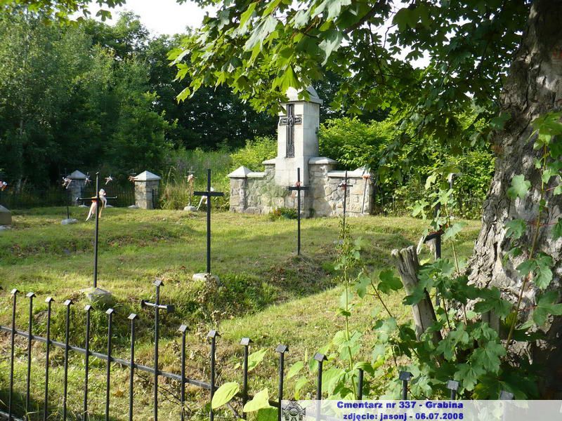 Cmentarz nr 336 w Grabinie po艂o偶ony jest na stoku wzg贸rza w艣r贸d p贸l i zagajnik贸w. Ja zjecha艂em do tego cmentarza polnymi dr贸偶kami z Czy偶yczki, sporo b艂膮dzi艂em zanim dotar艂em na miejsce, wi臋c drog臋 dojazdow膮 podam za przewodnikiem Frodymy: Z szosy Sobol贸w - Bochnia skr臋ci膰 w przysi贸艂ku Polanka na p贸艂noc (tu s艂up informacyjny cmentarza), w lokaln膮 drog臋 do Grabiny i Buczyny. Po 1700m (za drugim mostkiem) cmentarz po prawej w odlego艣ci 400 m. Przy drodze do Buczyny stoi wsp贸艂czesna tabliczka wskazuj膮ca cmentarz - na odcinku od cmentarza do Buczyny jest to normalna szosa asfaltowa, jak jest wcze艣niej nie wiem. Id膮c za znakiem po oko艂o 200 metrach dochodzimy do cmentarza nr 337.