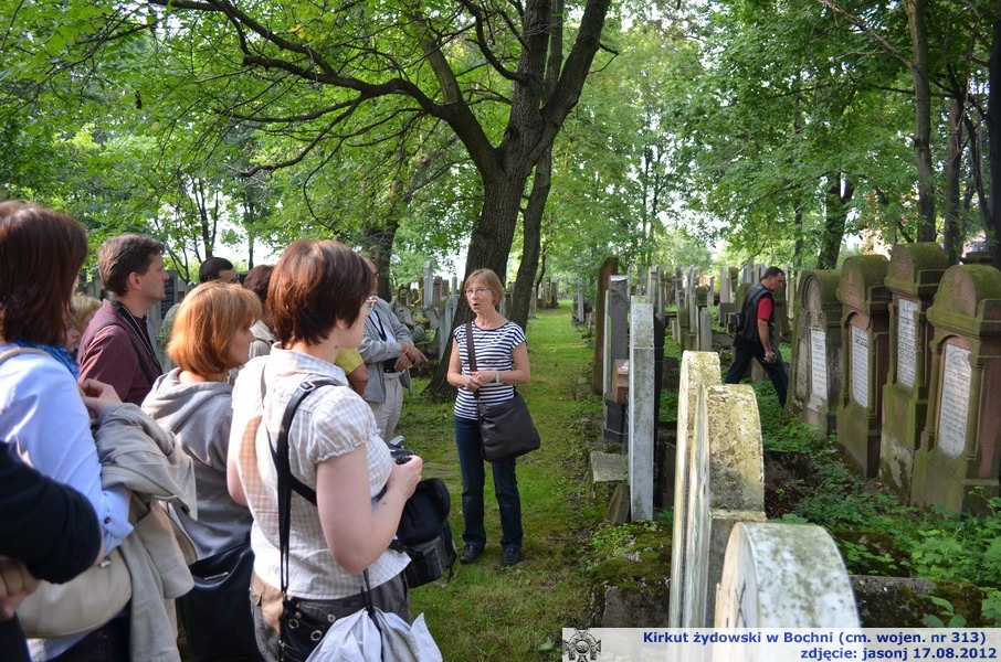 Po cmentarzu oprowadza艂a zebranych pani Iwona Zawidzka, kt贸ra podczas prawie p贸艂tora godzinnego spaceru pokaza艂a nam najciekawsze nagrobki na cmentarzu opowiadaj膮c niejednokrotnie histori臋 偶ycia i 艣mierci os贸b tam pochowanych. Kirkut 偶ydowski w Bochni zosta艂 otwarty w roku 1872, pierwsze zachowane nagrobki pochodz膮 z 1873 r. Wcze艣niej boche艅scy 偶ydzi wozili swoich zmar艂ych na cmentarz w Nowym Wi艣niczu, ale w tych latach panowa艂a zaraza i przepisy sanitarne zabrania艂y przewo偶enia zw艂ok, powsta艂 wi臋c cmentarz w Bochni. Ostatni poch贸wek na tym cmentarzu mia艂 miejsce w czerwcu 1945 r. ale na terenie kirkutu znajdziemy te偶 groby nowsze, cz臋sto odtworzone bo cz臋艣膰 macew zosta艂a zniszczona i wywieziona poza cmentarz o okresie II wojny 艣wiatowej. W wielu miejscach cmentarza stoj膮 wi臋c jednakowe betonowe p艂yty z krzy偶em Dawida, kt贸re postawiono w miejsce tych wywiezionych. Na samym kirkucie jest wiele zabytkowych grob贸w z bogata symbolik膮, kt贸ra co ciekawe do艣膰 rzadko nawi膮zuje do gwiazdy Dawida z kt贸ra kojarz膮 si臋 nam 呕ydzi.