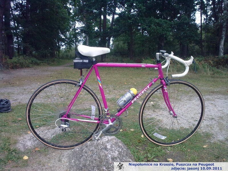 Mo偶na powiedzie膰, 偶e przez przypadek wpad艂 w moje r臋ce rower szosowy firmy Peugeot model Nice najprawdopodobniej z 1989 lub 1990 roku. Rower jest stary ale w 艣wietnym stanie, na oryginalnym osprz臋cie, kto艣 chyba bardzo ma艂o na nim je藕dzi艂. W sobot臋 nasmarowa艂em rower i wybra艂em si臋 na przeja偶d偶k臋 po Puszczy Niepo艂omickiej. Rower jedzie jak rakieta, oczywi艣cie nie mam bardzo si艂y 偶eby w pe艂ni wykorzysta膰 jego mo偶liwo艣ci, ani przez chwil臋 nie da艂em rad臋 jecha膰 na najtwardszym prze艂o偶eniu 52x13. Przez jaki艣 czas kr臋ci艂em na prze艂o偶eniu 52x15 i wtedy bez najmniejszych problem贸w rower jecha艂 36-38 km/h na godzin臋. Oczywi艣cie szybko si臋 zm臋czy艂em i potem w ruch posz艂y l偶ejsze prze艂o偶enia:) Mimo to utrzymywa艂em 艣redni膮 powy偶ej 30 km/h. Nad Czarnym Stawem po pokonaniu oko艂o 18 km mia艂em 艣redni膮 oko艂o 31,4 km/h. Nad Czarnym Stawem zrobi艂em post贸j bo musia艂em wyregulowa膰 koszyki przy peda艂ach, przy okazji zrobi艂em sesj臋 zdj臋ciow膮 roweru co prawda kom贸rk膮, ale niekt贸re zdj臋cia i tak wysz艂y lepiej ni偶 robione moim aparatem - kurcze chyba co艣 mi aparacik nawala.